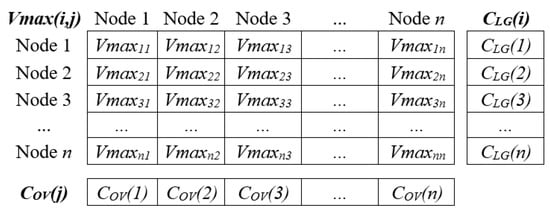 The table of maximum overvoltages is shown in Figure 6 and was used to define the parameters and . The table was the result of applying the n mentioned lightning discharges, created for each network topology under analysis. Table rows represent maximum overvoltages at all points after applying a discharge at a specific point i. The columns present the overvoltage maximum values developed for each point after the lightning discharges’ application. The maximum overvoltages table is an dimensional array.