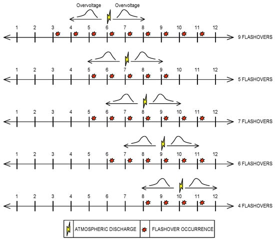 In addition, the sum of the values of would provide the overall number of flashovers that occurred after the application of discharges to a given network topology, as presented in Equation (7). The table will be created for each topology analyzed by the methodology.