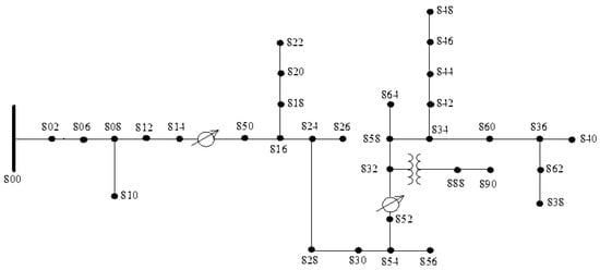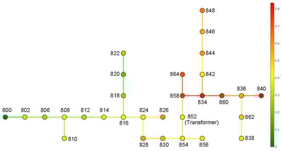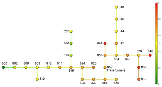 To test the proposed methodology, the IEEE 34 bus test feeder [36] was used, the single-line diagram of which is presented in Figure 10. Its rated voltage was 24.9 kV for the Medium Voltage (MV) grid, and loads were represented as equivalents connected at load buses along the feeder.
