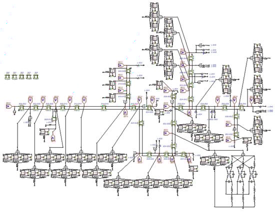 With respect to this feeder, some simplifications were used. Poles referring to Nodes 888 and 890 were grouped, representing the utility’s low voltage network as a concentrated load. In addition, voltage regulators between Points 814–850 and 852–832 were not considered in the study, and Nodes 850 and 832 were suppressed. Then, after these modifications, the IEEE 34 bus test feeder was modeled in ATPdraw software, using the proposed models P1, P2, and P3 for the different types of poles, as shown in Figure 11.
