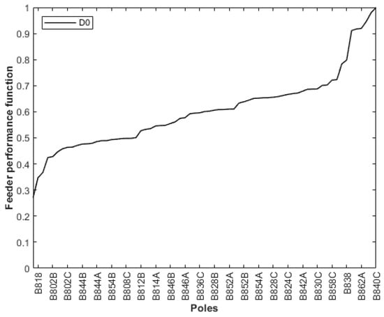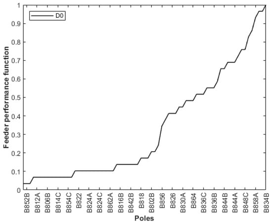 According to Figure 20, a moderate reduction was graphically noted in the D function for the allocation of lightning arresters only at the transformer’s pole. However, considering the simultaneous allocation of lightning arresters at the transformer’s pole, and at the most critical Poles 840, 864, 862, 838, 826, and 860, there was a considerable reduction in the D function, improving network protection globally.
