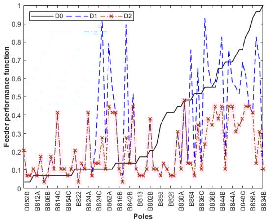 A comparison between D functions for three situations is shown in Figure 13. The curve D0 represents the performance function for the base case. Curve D1 shows the performance function after the installation of surge arresters on Pole 852 where the transformer was installed. Curve D2 represents the situation D1 including lightning arresters at the most critical Pole 834 indicated by function D.