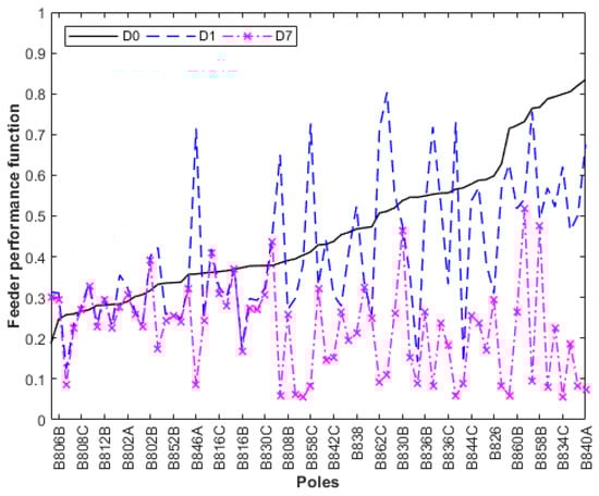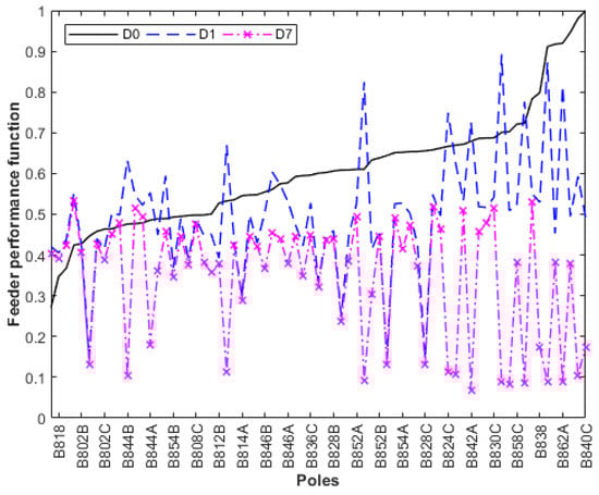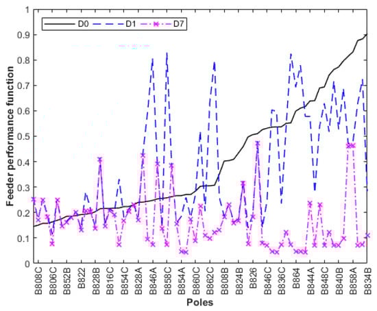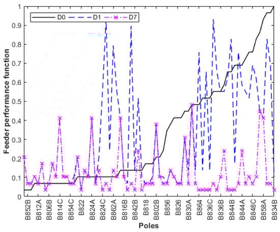 According to Figure 13, there was a considerable reduction in the D function for allocating lightning arresters at the most critical Pole 834. Additional reductions could be reached by installing more lightning arresters at other critical poles. In Figure 14, a comparison of D functions for the base case (curve D0) is presented; installing lightning arresters only at the transformer electrics nodes (curve D1); and installing lightning arresters simultaneously at the transformer pole and at the most critical Poles 834, 858, 860, 848, 840, and 844 (curve D7).