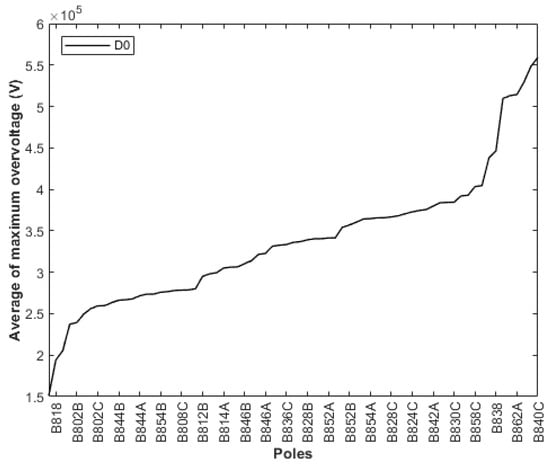 In this case, it was observed that at Pole Number 840, the D function had the maximum value; therefore, = 100%, being classified as the most critical point for the incidence of lightning discharges. The poles’ averages for maximum overvoltages occurrences for lightning discharges at each pole at a time are shown in Figure 18.