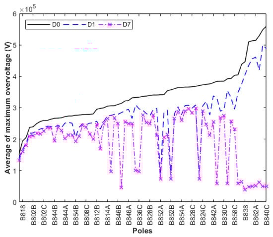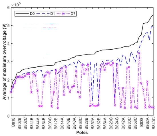 Average values of maximum overvoltages for Case 2: without lightning arresters (D0); lightning arresters installed at the transformer’s pole only (D1); and installed at the six critical poles plus the transformer’s pole (D7).