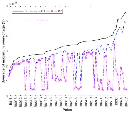 Average values of maximum overvoltages for m = 0.25 and n = 0.75: without lightning arresters (D0); lightning arresters at the transformer’s pole only (D1); and lightning arresters at the transformer’s pole and at the six most critical poles (D7).