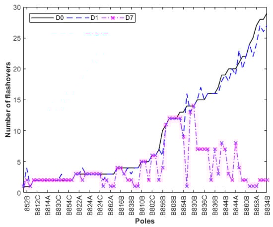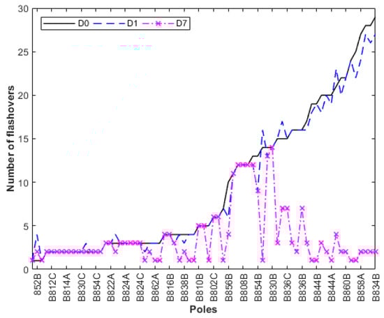 Comparing flashover occurrences for Case 3, with m = 0.5 and n = 0.5: base case (D0); lightning arresters at the transformer’s pole only (D1); lightning arresters at the transformer’s pole and at the six most critical poles (D7).