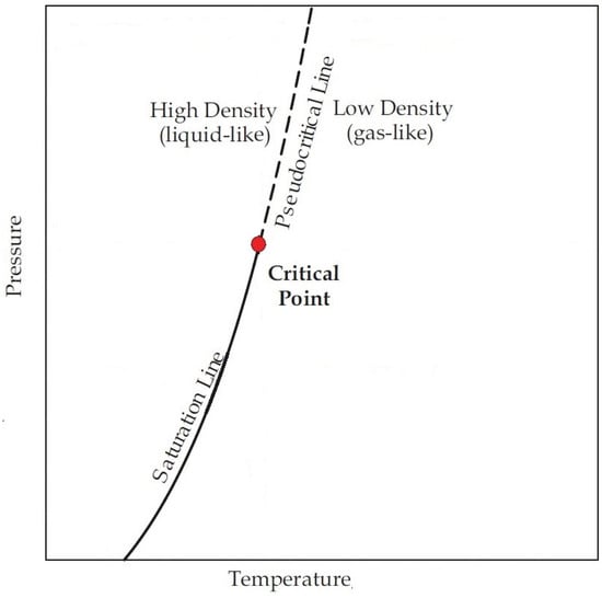 A supercritical fluid is characterized by pressure and temperature above the fluid’s critical values. In fuel injection phenomena, specifically in combustion chambers, both fuels and oxidizers’ operating conditions can exceed their critical point as a means to increase the engine’s efficiency [1,2,3]. At an arbitrary constant temperature, a gas can be converted to a liquid by increasing the pressure. As temperature increases, so does the kinetic energy of the molecules, requiring a higher pressure to bring the gas to a liquid. The critical temperature, , marks the point after which a transition to the liquid phase is no longer possible, no matter the applied pressure. The vapor pressure at the critical temperature is then defined as the critical pressure, . The critical point then marks the end of the vapor pressure line, where both temperature and pressure reach their critical values.