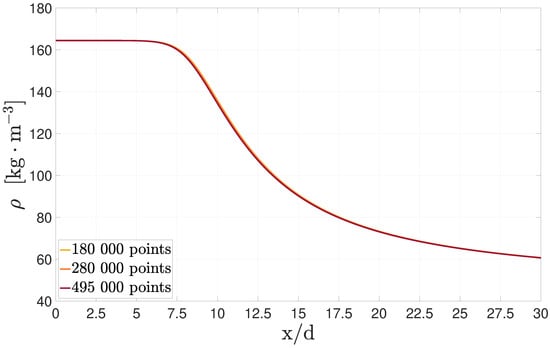An independence mesh study based on the centreline decay of the density is performed using three levels of refinement with 180 000, 280 000, and 495 000 points in a structured orthogonal mesh of rectangular elements. The comparison is made for case 4 from Table 1, and the results, with the standard model, are shown in Figure 6. Despite a very slight variation of density values in the transition region, the three meshes provide close results to one another with similar slopes, indicating that the flow is sufficiently well resolved with the coarser grid. The more refined grid is not applied because the gained accuracy does not justify the additional computational cost, and the mesh of 280 000 points is used over the coarser one to maintain grid independence for the remaining turbulence models.