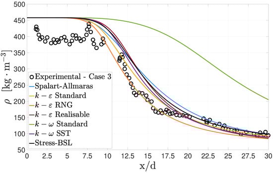 Centerline density decay in case 3 with different turbulence models.