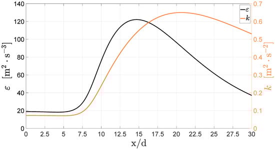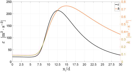 Centreline distribution of the turbulent dissipation rate and kinetic energy in case 3 with the standard model.
