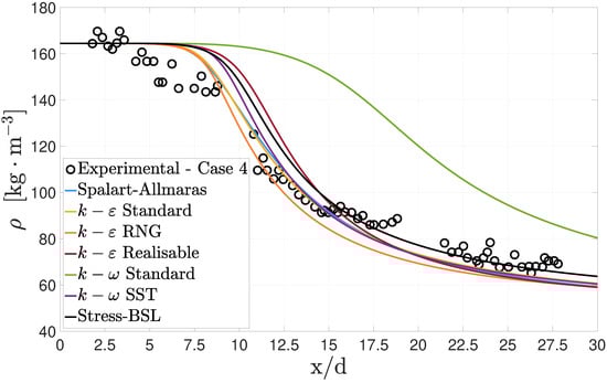 Centreline density decay in case 4 with different turbulence models.