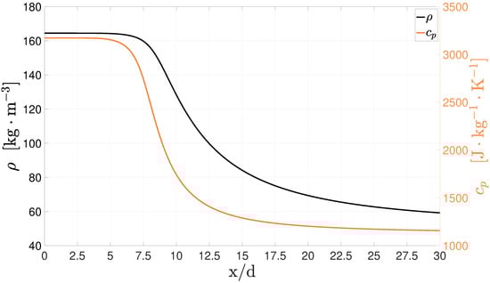 In case 4, the differences in potential core length, depicted in Figure 10, are similar to those of case 3, ranging from to with the standard being once again the exception. Injection density is considerably reduced in this case when compared to that of case 3, and, as a consequence, there is no longer an apparent density overestimation in the potential core. However, an unrealistic potential core is still predicted independently of the turbulence model. In this case, the Stress-BSL model is the only one to correctly predict density values between while the remaining provide a slight under prediction. Nevertheless, its behavior outside this region is not exceptional, and the overall results do not justify the additional computational cost. Results from the RNG continue to be acceptable, but there is also an improvement from the standard and the Spalart–Allmaras models for which the outcome is nearly identical. The decrease in the turbulence energy dissipation happens soon, at an (Figure 11) As it can be seen in Figure 12, since the pseudo-boiling line is not crossed, there is not a peak in the , which has an evolution in accordance to the axial density decay. The injection temperature of 137 K is already above the pseudo-boiling temperature, and there is no peak in the specific heat. remaining fairly constant until 5 along with the temperature inside the potential core, and begins then to decrease.