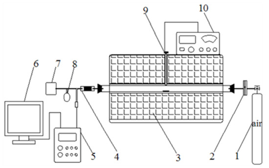 The diagram of experimental apparatus: 1. gas bottle; 2. flowmeter; 3. tubular furnace; 4. filter; 5. flue gas tester; 6. computer; 7. effluent gas treatment system; 8. gas collecting bag; 9. thermocouple; 10. temperature controller.