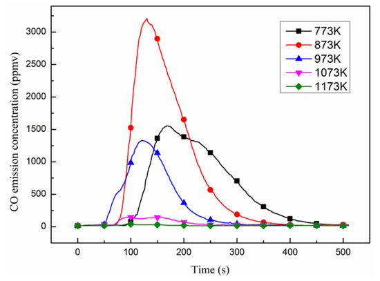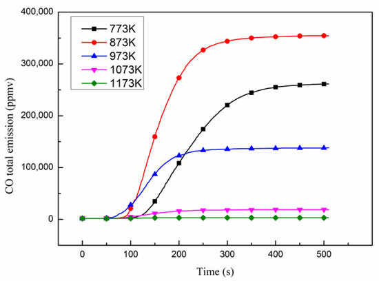 The total CO emissions at different temperatures are shown in Figure 3. The slope of the curve shows that the CO overflow rate increased at first, then decreased, with a maximum value of 127.5 ppmv/s at 873 K. However, the total emission also first increased and then decreased just like the variation tendency found in the literature [20,23]. Total emission arrived at 873 K, with its peak value as 354,570 ppmv, which was 194.61 times as large as the minimum (1822 ppmv). This may be because 873 K is an excess temperature from incomplete combustion to complete combustion, whereas, CO can hardly overflow at 1173 K, indicating that soybean straw burned to a complete state.