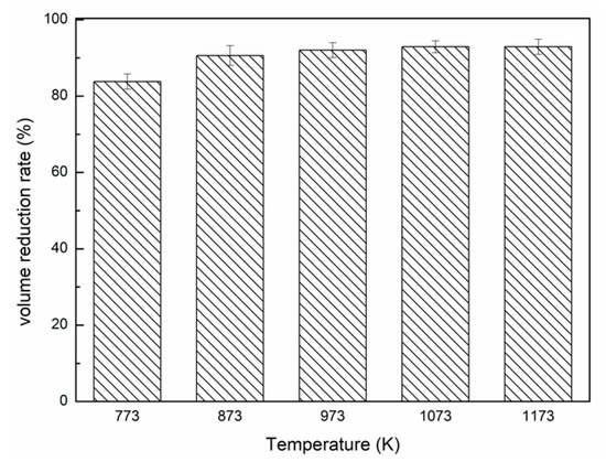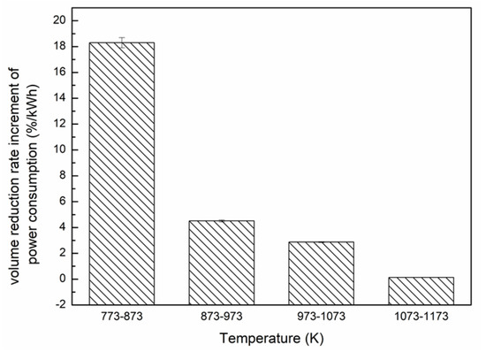 As seen in Figure 10, the volume reduction rate increment of unit power consumption during 773–873 K had a maximum value of 18.304%/kWh. However, when the experiment entered the next three temperature stages of 873–973, 973–1073, and 1073–1173 K, the relevant value sharply declined to 4.504%, 2.871% and 0.127%/kWh, respectively. It meant that when the temperature was higher than 873 K, the material volume lessens little with the power input. Therefore, a temperature higher than 873 K should be selected in order to reduce the volume to a large extent.