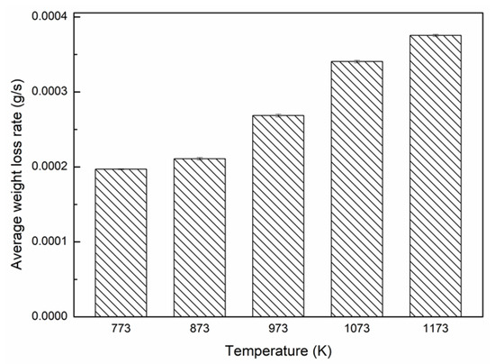 From 873 to 1173 K, the weight loss can be related to the reduction reaction of semicoke with CO2 [28,29] and degradation of minerals [30]. However, the average weight loss rate rose as the combustion temperature increased, indicating that high temperature is quite advantageous to rapid volume reduction of material. Moreover, 873 K was the inflection temperature of the average weight loss rate. The average weight loss rate at 973, 1073, and 1173 K increased by 27.38%, 61.47% and 77.97%, respectively, relative to that of 873 K; it stood to reason that complete combustion could promote volatile to separate out, cause the flammable substance to break down, and raise the combustion efficiency [31].