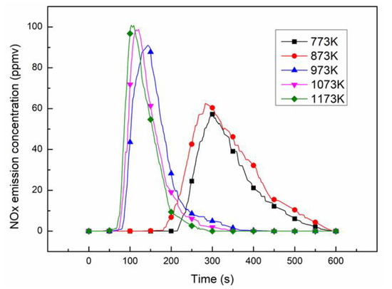 Figure 6 shows the NOX emission concentration under different temperatures. As shown in the figure, the NOX peak concentration increased as temperature rose, and the time to reach peak concentration shortened. The most conspicuous difference occurred between 873 and 973 K; within that range the peak concentration increased 63.75%, and the time to reach peak concentration was reduced by 143 s. Combined with the analysis of CO emission, it is clear that NOX formation has a strong relation to combustion temperature and combustion state [32,33,34].