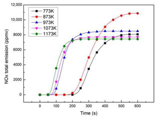 NOX total emission, under different temperature levels, is shown in Figure 7. The occurrence time of NOX advances with the increase of temperature. After the temperature is higher than 873 K, there is a large span advance. When the temperature was 973, 1073, and 1173 K, the output time was moved forward by 102, 110, and 119 s, respectively, compared to 873 K. It seems that NOX formation could be related to combustion temperature [35]. However, the total emission of NOX increased first and reduced afterward, reaching its peak value (10,875 ppmv) at 873 K, increasing to about 46.11% of the total emission (7443 ppmv) at 1173 K; according to previous studies, possibly because at high temperature the catalysis of alkaline earth metal oxide reduces the NOX [36,37]. On the other hand, the reaction between NOX and CO is shown in Equations (10) and (11). The main products are N2 and N2O. The products in the high-temperature range are mainly N2 [26,38]. At the same time, a large amount of volatiles will overflow at high temperatures. A large number of carbon pore structures are produced, which makes NOX more likely to contact coke [39,40], and the reaction Equation (12) consumes some NOX, resulting in a reduction in the total amount of NOX.