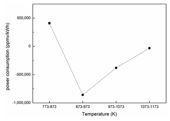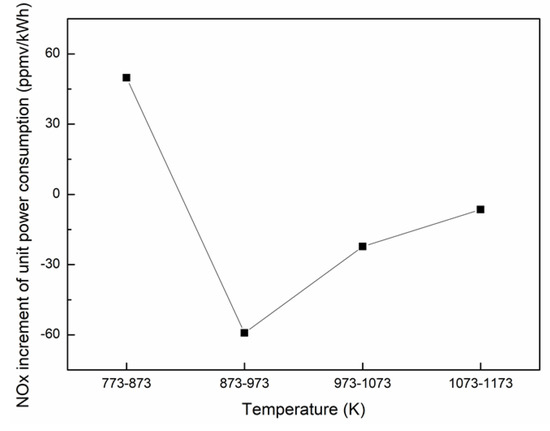 The CO, NOX and volume reduction rate increment of unit power consumption in different combustion temperatures are shown in Figure 8, Figure 9 and Figure 10.