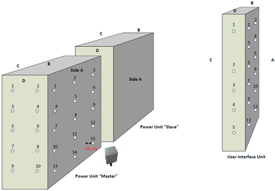 where, in Equation (1), Xj is the field amplitude at frequency j, and RL(Xj) is the field RL at frequency j; in Equation (2), t is time, Ai is the amplitude of the ith harmonic component of the field, RLi is the RL at the ith harmonic frequency fi, θi is the phase angle of the field, and φi is the phase angle of the filter at the harmonic frequencies. Both indexes were calculated considering RLs of Recommendation 1999/519/EC. If the index value is ≥ 100 (if expressed in percentage terms), the exposure will be considered not compliant. The measurement procedure, developed in [7], was adopted and improved during the test campaign. Briefly, the B-field actual values and the EIs were measured at a distance of 10 cm (between the center of the probe and the unit’s surface) on a grid of measurement points on each side of the units. The grid was evenly spaced according to the geometry of the unit under test. Figure 2 shows, as an example, the measurement grid used for the two power units and for the user interface unit of HPCS 1.