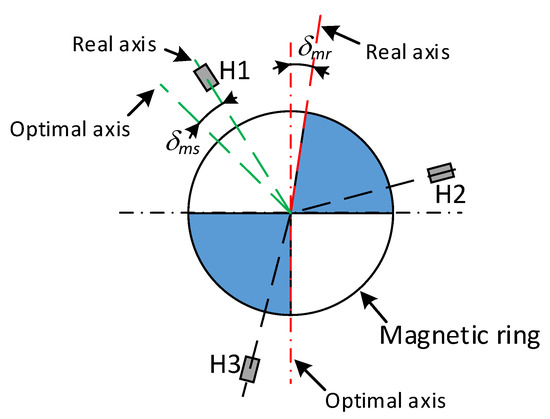 The disadvantages resulting from the real, different from ideal, arrangement of shaft position sensors are known, and described in detail in the literature [6,7,8,9,10,11,12,13]. This problem is caused by the relatively low accuracy of the motor shaft position determination system during mass production. Researchers’ efforts focus on compensating for sensor placement errors by assuming perfect symmetry of the rotating magnetic element (Figure 1 = 0). This makes it possible to treat the multipolar machine as a machine with one pair of poles [14,15,16]. Defining the errors in the measurement of the speed and position of the motor shaft, resulting only from the incorrect arrangement of sensors, is a large simplification in the analysis of the operation of the real system for determining the position of the BLDC motor rotor. If the error concerned only the sensor location accuracy (– Figure 2), the speed measurement errors could be uniquely determined for each combination of Hall sensor states. In fact, these errors result to the same extent from the accuracy of sensor placement (), as from the accuracy of making the magnetic ring rotating coaxially with the shaft (); see Figure 2. The angular velocity of the shaft, measured by the microprocessor system as a value inversely proportional to the time of changing the state of the position sensor values, amounts to: