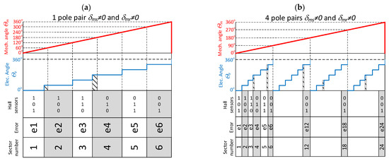 For a motor with one pair of poles six unique error values can be assigned to a specific state of Hall sensors (Figure 3a), while for a motor with the number of pole pairs greater than one, these errors cannot be assigned to a specific state of sensors (Figure 3b).