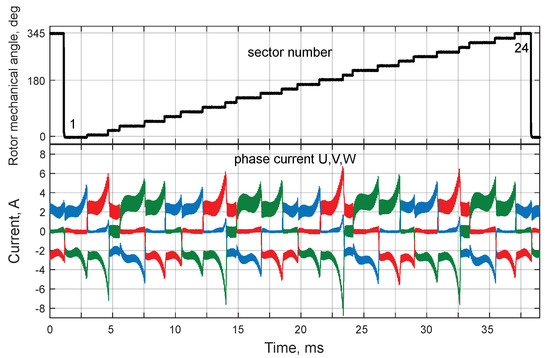 Errors and result in switching the keys of the motor stator winding controller in a suboptimal position of the rotor, which in turn leads to the electromagnetic torque pulsation of the motor, increases the amplitude of its current (Figure 4) and the noise level of the motor operation. Boosting the amplitude of the current results in an increase in electrical losses and electromagnetic interference, and forces the constructors of the controller to use in it transistors with a higher rated current, so that they do not suffer thermal and dynamic damage during long-term operation [17].