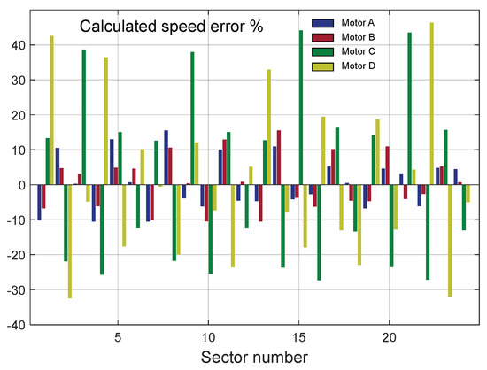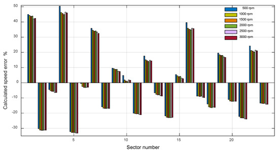 In the course of the work described above, errors in determining the rotational speed for individual sectors of the motors, tested at different rotational speeds, were determined. It was shown that for a wide range of rotational speeds, these errors are almost constant, and what is worth underlining, unique for the specific motor used in the test. This is illustrated in Figure 8 for the motor marked as “D”.