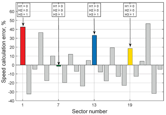 The procedure for determining the absolute position of the rotor is, in the simplest possible implementation, to search for the largest error for the same selected sequence of their state, and to assign its sector number to the sector number of the maximum error of the reference distribution. For example, sectors 1, 7, 13 and 19 (Figure 10) correspond to the sequence (H1 = 0; H2 = 0; H3 = 1). After determining the speed calculation errors, the algorithm compares the results obtained with the reference values stored in the controller’s non-volatile EEPROM memory. If the reference error values stored for specific sensor signals reached the maximum value, e.g. for Sector 7, then after searching the newly obtained error distribution, and finding the maximum error value, e.g., for sector 13, one should change the sector number in which the greatest error of speed measurement was found. In this particular case, sector number 13 will be changed by the algorithm determining the position of the shaft to number 7, and the remaining sector numbers will be automatically assigned to the following sectors of Figure 11 by means of software incrementation.