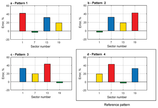 Figure 7 shows the calculated speed error values for the individual sectors for four different BLDC motors with powers ranging from 60 W to 1500 W. All motors had four pairs of poles each, for which 24 sectors of speed measurement can be defined per one mechanical revolution. Each of them corresponds to a mechanical rotation angle equal to π/(3∙p), which gives an angle value for each sector equal to 15 mechanical degrees.