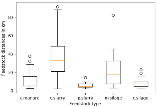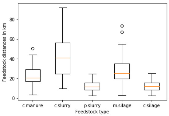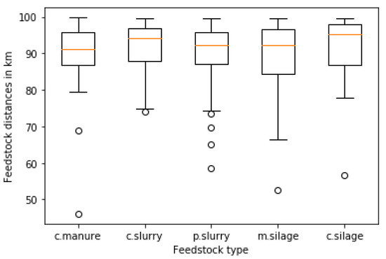 | Type of the Feedstock | Amounts (t/a) | Maximum Distance (km) | Objective Function Value = Cost of Methane (EUR/m3) | Possible Solutions |