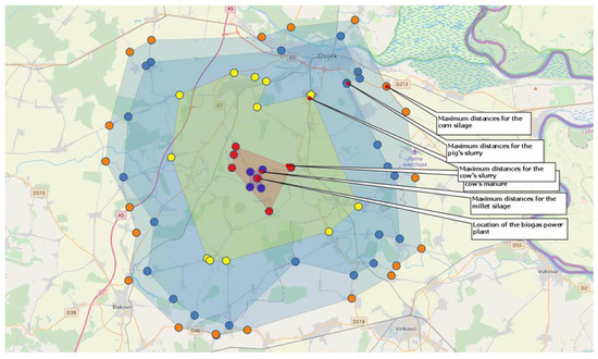 - Red circles represent the maximum distances for the collections of the cow’s slurry using local roads,