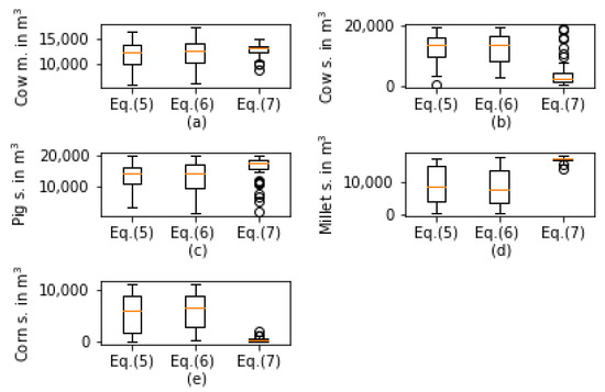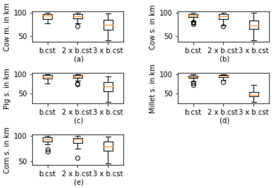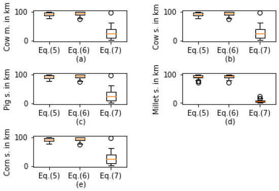 - Using Equation (6) (including maximization of the distances only) enables us to find the upper limit of profitable feedstock distances considering the methane production cost constraint (Equation (23)) (profitable limit of the methane production cost).