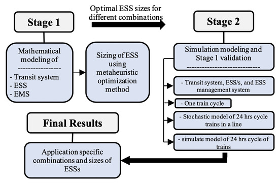 In this paper, a two-stage modeling technique, as shown in Figure 1, has been developed for obtaining the most suitable combination and size of WESSs for the DC rail transportation systems. In the first stage, a mathematical model has been developed by a detailed inclusion of the characteristics and constraints in the storage technologies consisting of battery, SC, and flywheel. The mathematical model also takes into consideration the constraints of the rail transportation system, demand charges by utility companies based on peak power in a day, energy cost by utilities, life-cycle cost of ESSs, and maximum achievable utilization of the ESSs with minimum degradation of SoH. This mathematical model has been optimized using GA. The second-stage comprises the use of a detailed simulation model of rail transportation system, train, ESS, and EMS, which have been developed in MATLAB/Simulink. This stage is vital to (a) validate the fidelity of the mathematical model and (b) accurately capture the dynamics of rail transportation system along with ESSs, whose emulation by mathematical equations is complex to develop. This stage uses the optimal sizes from the first stage as guiding parameters to perform the simulations for both single and 24 h cycle of trains. The simulation results infer application specific choices of type, size, and combination of ESSs.