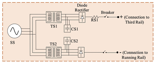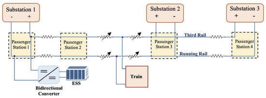 Generally, DC electric rail transportation systems consist of geographically distributed power supply substations and rail networks. Power supply substations convert AC voltage of the main grid to DC voltage and deliver power to the trains, which are the main load of the system. A portion of such a system, used as case study, is presented in Figure 2. It consists of three power supply substations, four passenger stations, and a train. The system parameters and modeling have been elaborated in Section 4. As a train accelerates from one passenger station, it consumes energy from the substations and subsequently regenerates the same while decelerating into the next passenger station. The regenerative braking energy travels to the third rail, where a small portion of it can be recaptured by other loads in the system. The remaining energy, if not captured, will raise the voltage of the third rail and trigger the chopper circuit to dissipate it as heat in a resistor.