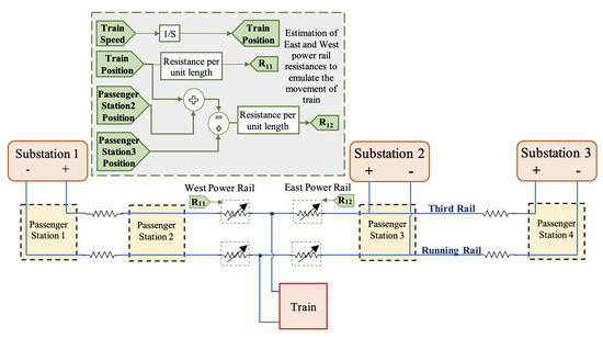 The movement of a train on traction rails is simulated by varying two set of resistances, which are specified in terms of resistance per unit length (m/km), at each sampling time of the simulation (refer to Figure 5). One set of resistances, called the West Power Rail, is multiplied by the distance between train position and its departure point, where the train position is obtained by continuously integrating its speed. The second set of resistances, called East Power Rail, is multiplied by the distance between the train’s current position and its arrival point, which in this case is Passenger Station 3.