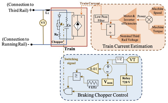 Consequently, product of torque and angular speed provides the power required by the motor drive. This power is divided by voltage, at the point of connection of the train to the rails, to obtain the required current. The current profile thus obtained, is provided to a current source that is connected to a chopper circuit, as illustrated in Figure 6. The chopper switch is operated based on the maximum voltage level of the third rail. This is an overvoltage protection which dissipates the train energy as heat in resistor when the third rail voltage exceeds its nominal value.