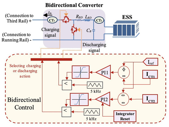 Characteristics of the three types of ESSs, such as charging/discharging efficiency, cost of power, cost of energy, voltage level, number of cycles, and so on, used for this case study, are presented in Table A2. Design of bidirectional converter and its control strategy is elaborately depicted in Figure 7. As shown in the figure, the bidirectional converter is controlled using a current control strategy. The reference current, , is obtained from optimization of the mathematical model. Parameters for tuning the bidirectional controller are included in Table A2.