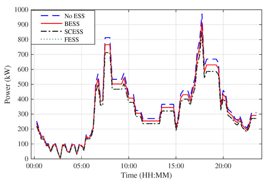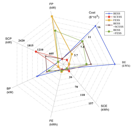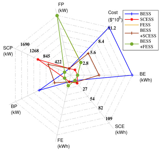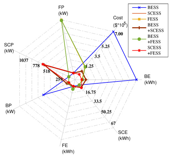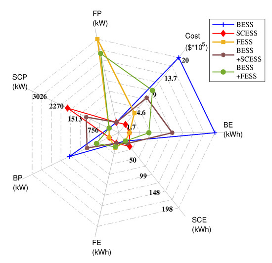 It is also to be noted that the integration of SCESS with FESS yields the same result as a standalone SCESS. This is because the solution provides a considerably small size for energy and power of flywheel in a hybrid system consisting of SC and flywheel. It is a logical outcome as there is no need to combine two technologies with comparable power and energy densities. Thus, this hybrid system of SCESS and FESS, although not practically feasible, has been included in Figure 8 but eliminated from the other results.