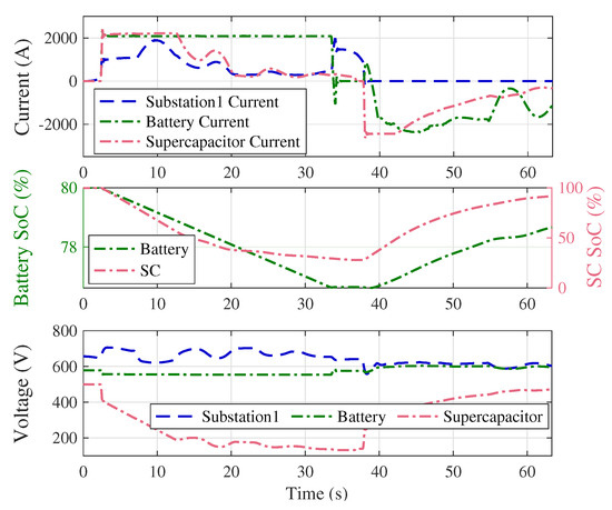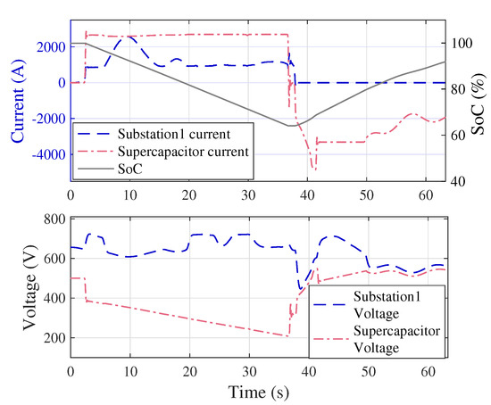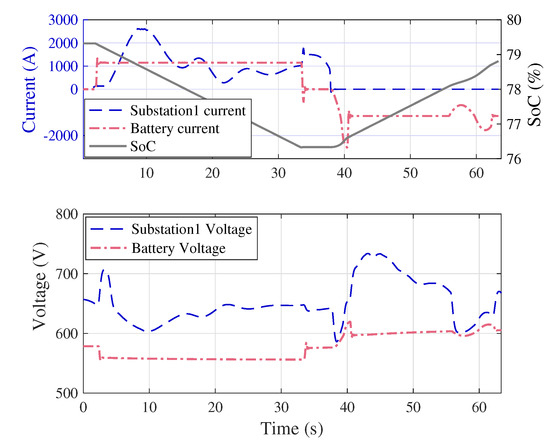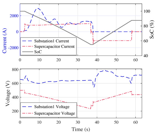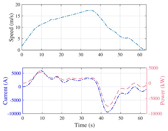 In this section, the theoretical values for the sizes of ESSs, which have been obtained from the optimization method for saving 15–45% of regenerative energy, are substantiated by simulating the prototype (Figure 2) in MATLAB/Simulink. The scenario represents a train accelerating from passenger station 1 and decelerating at passenger station 2. A standard speed profile of the train has been used and its corresponding current and power profiles are shown in Figure 12. In addition, the substation 1 current along with the third rail voltage, without any ESS, is shown in Figure 13.