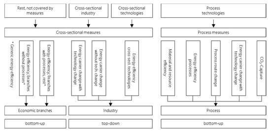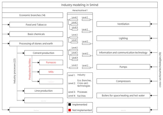 Figure 1 summarises the bottom-up technology modelling in SmInd. Individual production facilities are assigned to processes that are mapped using activity parameters. For these processes, annual production volumes [22,25], specific electricity and fuel consumption are available [1]. In turn, the processes are subordinated to economic branches on the left side of the figure. As part of the modelling of the technology mix scenario in SmInd, the processes are extended by a fuel distribution [36,37,38,39,40,41]. Cross-sectional technologies are modelled at a non-process-specific industrial level based on [42]. The model distinguishes ten cross-sectional technologies. Some examples are shown in Figure 1 on the right side. In the middle of Figure 1 the different hierarchical levels in the model are shown. A total of four hierarchy levels are distinguished in the model.