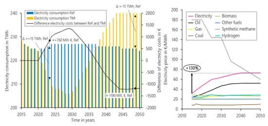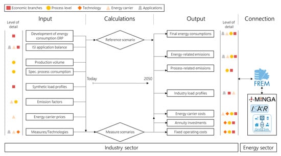 The functional principle of SmInd and its integration into the FfE model landscape (right-hand side) is shown in Figure 2. The figure also contains the level of detail of individual input and output variables on the left side. The operation base is the reference scenario, which contains the energy and emission-oriented reference development of German industry from 2015 to2050. In the reference scenario, the branch-specific energy consumption by energy carrier is determined based on existing scenarios up to the target year. In turn, this data serves as a basis for specifying energy consumption by application and temperature level according to [33,35]. Based on the energy carrier precise consumption, emission factors are used to compute the energy-related emissions of the reference scenario. Specific process emission factors are also used to determine the process-related emissions based on the production volume of the process. In addition to the bottom-up calculation, process-related emissions are also distributed top-down to the economic branches on the basis of the national inventory report [1]. The energy costs are based on the given energy prices and energy consumption data and are stored depending on the specific energy carrier. The reference scenario and the activity parameters are the baseline of all other implemented and calculated scenarios [1,32].