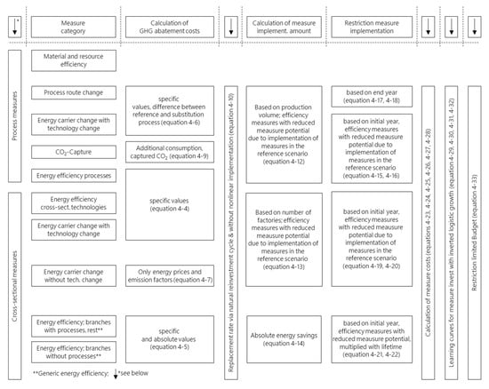 Figure 5 shows the basic methodology for the GHG abatement measure implementation depending on the measure category. The allocation of the equation to the respective implementation step and the measure category can also be taken from Figure 5.