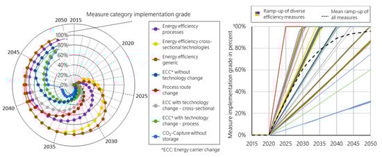 The criteria for the full implementation of a measure also differ with regard to the measure category. Process measures are considered fully implemented as soon as the entire production volume is produced with or supported by the technology (see Equations (13) and (14)):
