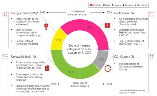 - Guminski, A.; Hübner, T.; Gruber, A.; von Roon, S. Model based Evaluation of Industrial Greenhouse Gas Abatement Measures; Forschungsgesellschaft für Energiewirtschaft mbH: München, Deutschland, 2019. [Google Scholar]
