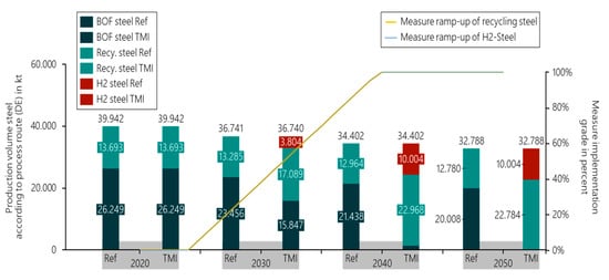 Process measures are divided into five measure categories in the technology mix module and affect the production processes as well as the associated industrial production facilities (Furnaces, electrolysers, mills and other industrial production facilities). Efficiency measures reduce the energy consumption of the processes. The process route change describes the conversion of conventional to new production processes for manufacturing the same product. In the technology mix module, it is possible to switch from one reference to several substitution processes. The energy carrier change with technology change at process level describes the conversion of existing facilities enabling the switch to climate-neutral energy sources. CO2-capture reduces both energy and process-related emissions in selected industrial production processes. No CO2-storage takes place because the captured CO2 is used in the supply sector to produce synthetic methane. The material and resource efficiency is indirectly considered in the model via the development of the production volumes and the specific process consumption and is therefore not described in more detail in the following sections. Process measures are always linked to the activity parameters of the production process. A detailed description of the measure categories can be found in [1,32]. The description of the technology mix scenario provides examples in the Section 1.
