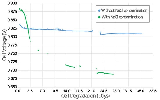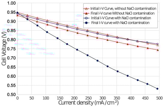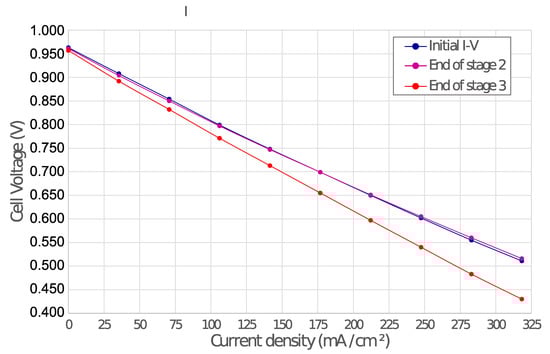 The I-V curves obtained after 850 h of cell operation without salt contamination exhibited a drop of 25 mV cell voltage when compared to the initial baseline curve.