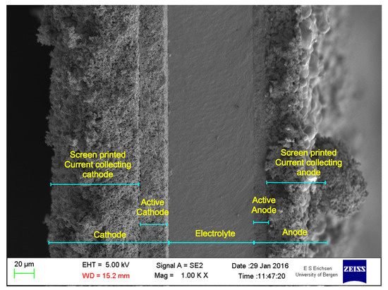 Cross-sectional SEM image of the entire cell operated at 850 C, after a short-term degradation test.