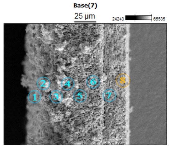 Cross-sectional SEM image of the cathode showing the points at which X-ray diffraction was performed to analyse the components present.